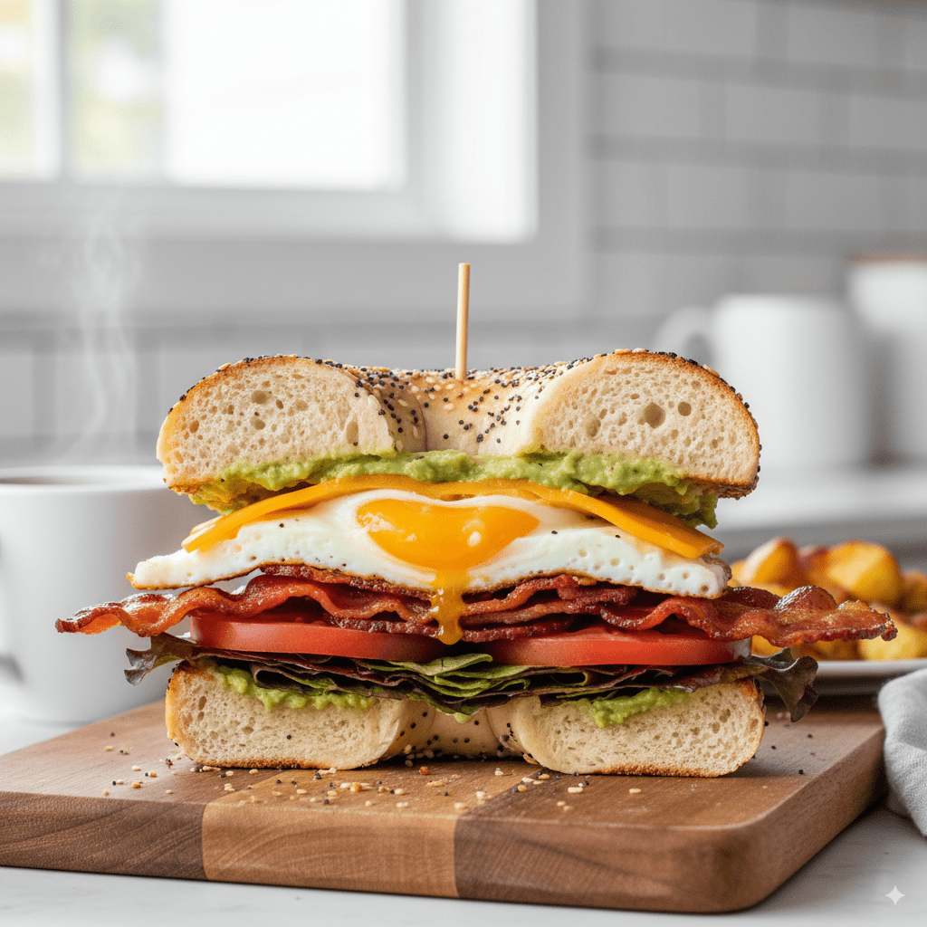 This Bacon & Egg Bagel Sandwich is the perfect grab-and-go breakfast. Crispy bacon, fluffy eggs, creamy avocado, and a touch of spicy mayonnaise come together on a toasted bagel or croissant for a hearty and satisfying start to the day.