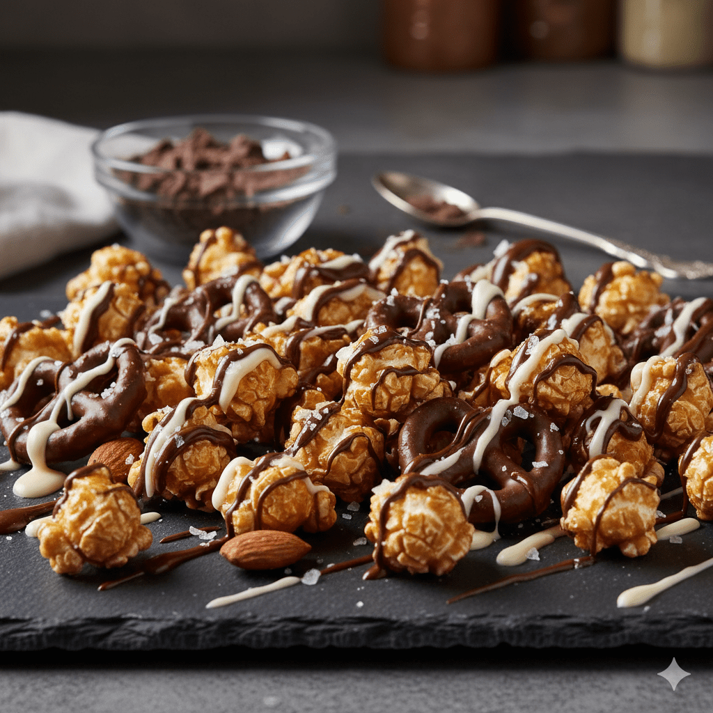 Chocolate Caramel Popcorn is made by popping fresh kernels in a popcorn maker, coating them with homemade caramel, baking for crispiness, and finishing with a chocolate drizzle. It delivers a crunchy, sweet, and chocolatey snack you can enjoy anytime.